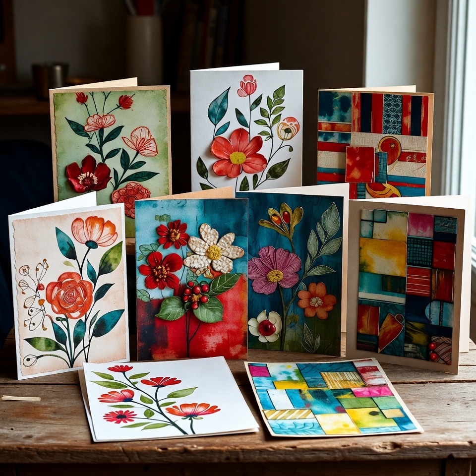 Each greeting card is layered with textured papers and intentional blank space, ready for your words.